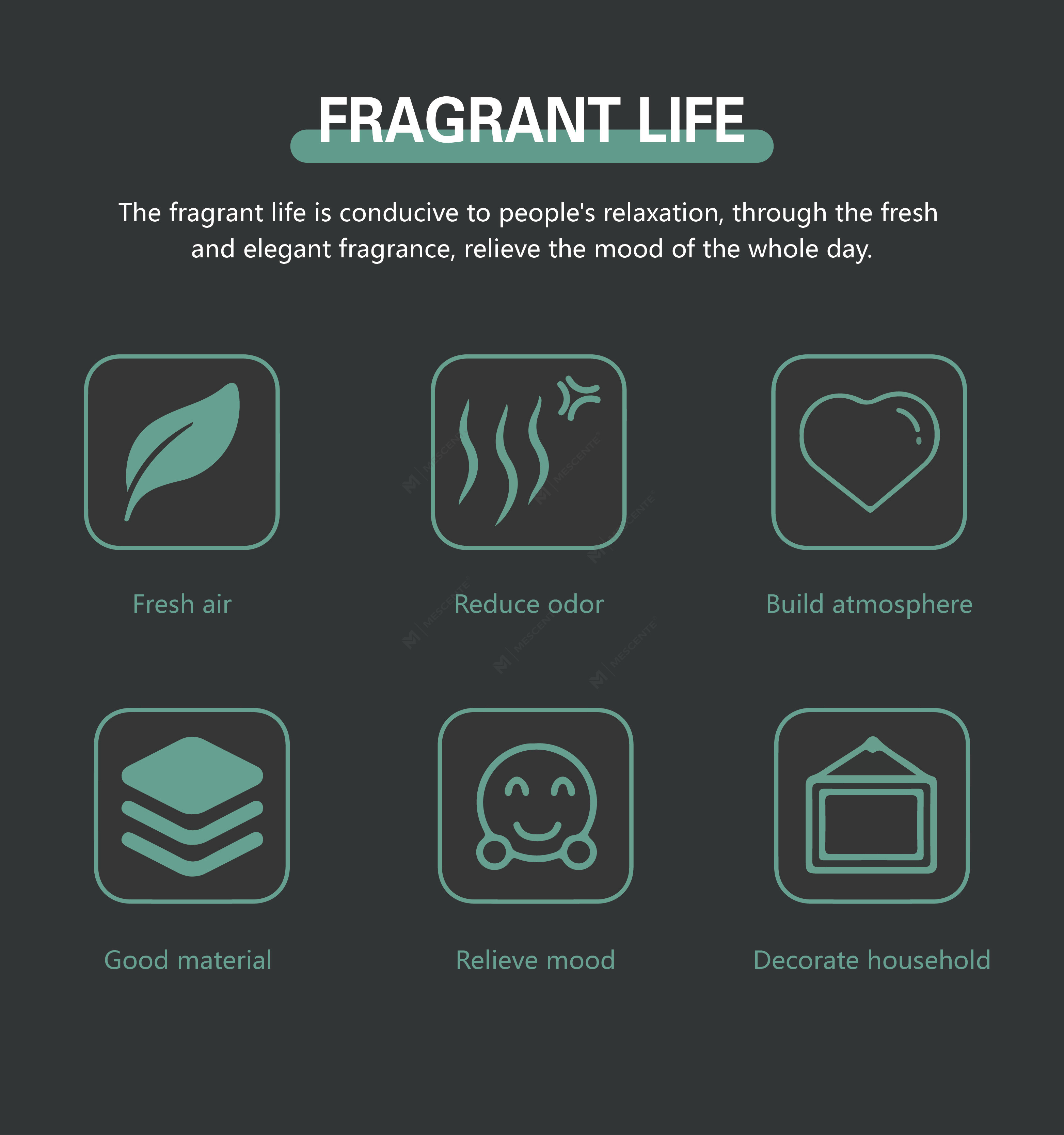 MESCENTE es una empresa totalmente integrada que se especializa en diseño, producción y ventas, enfocada en el diseño de fragancias para el hogar, el cuidado del aire del hogar y la mejora de la purificación del aire. La empresa ha establecido un sistema de gestión de calidad integral y científico, dedicado a proporcionar productos y servicios que incorporan "salud, naturaleza, romance y comodidad"