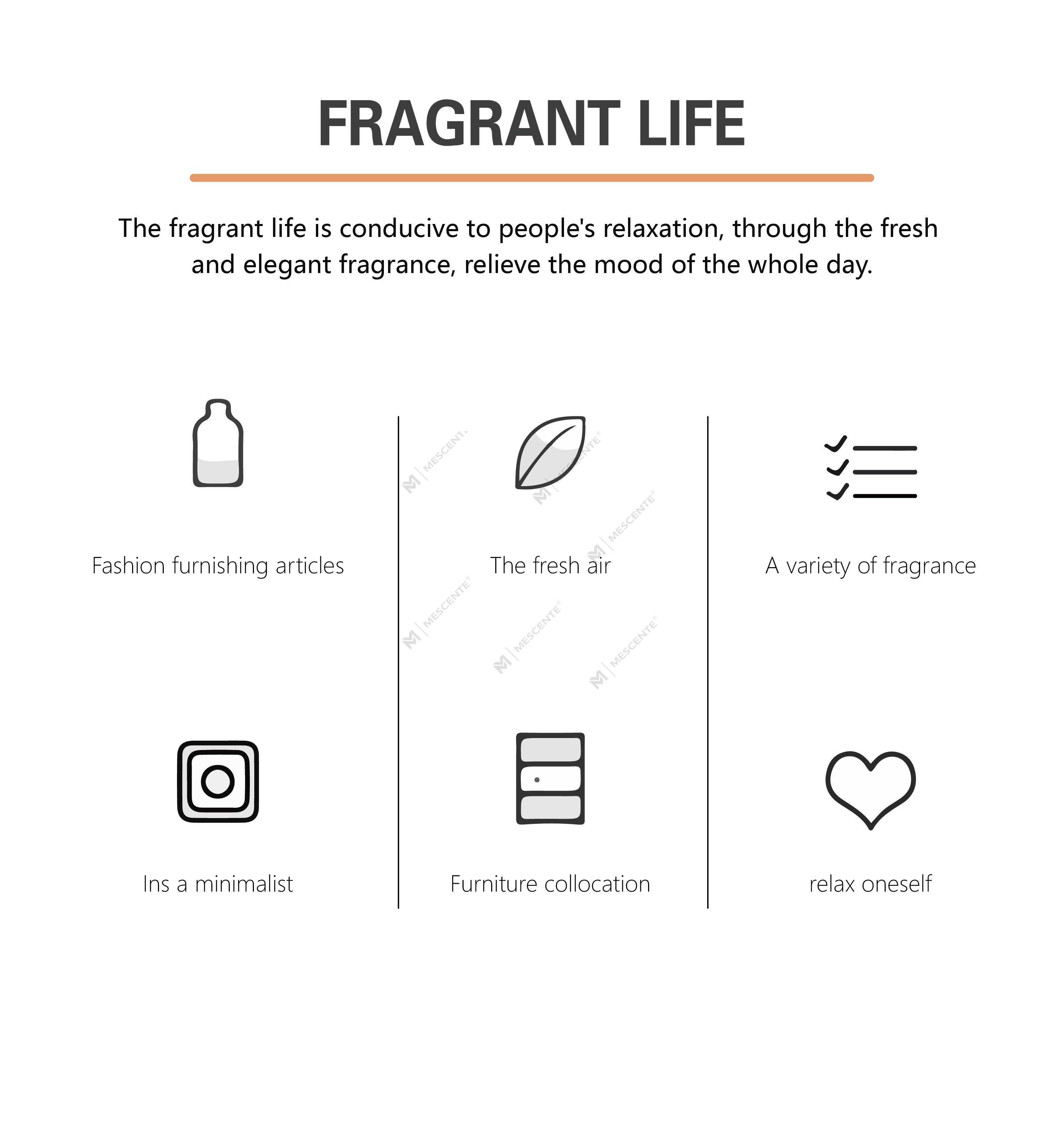 MESCENTE es una empresa totalmente integrada que se especializa en diseño, producción y ventas, enfocada en el diseño de fragancias para el hogar, el cuidado del aire del hogar y la mejora de la purificación del aire. La empresa ha establecido un sistema de gestión de calidad integral y científico, dedicado a proporcionar productos y servicios que incorporan "salud, naturaleza, romance y comodidad"